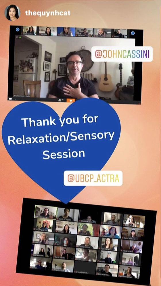 Acting teachers have embraced Zoom too. Across the country, you can find auditioning, scene study and voice-over classes available online. Here in Vancouver, John Cassini, the chair of UBCP/ACTRA’s Member Education Committee, does a Zoom relaxation/sensory class – a remarkably helpful session for our many members who are in quarantine by themselves.